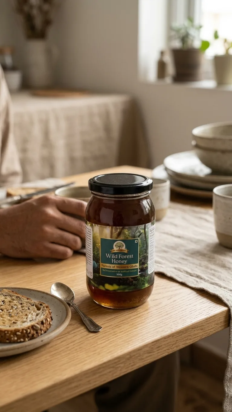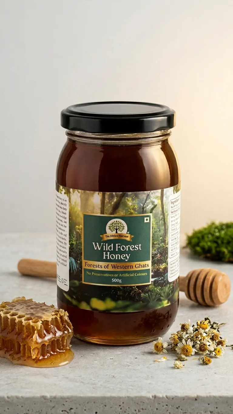 Pure, unprocessed honey from deep forests, rich in natural enzymes and wildflower goodness, ethically harvested by tribal communities in the Western Ghats.